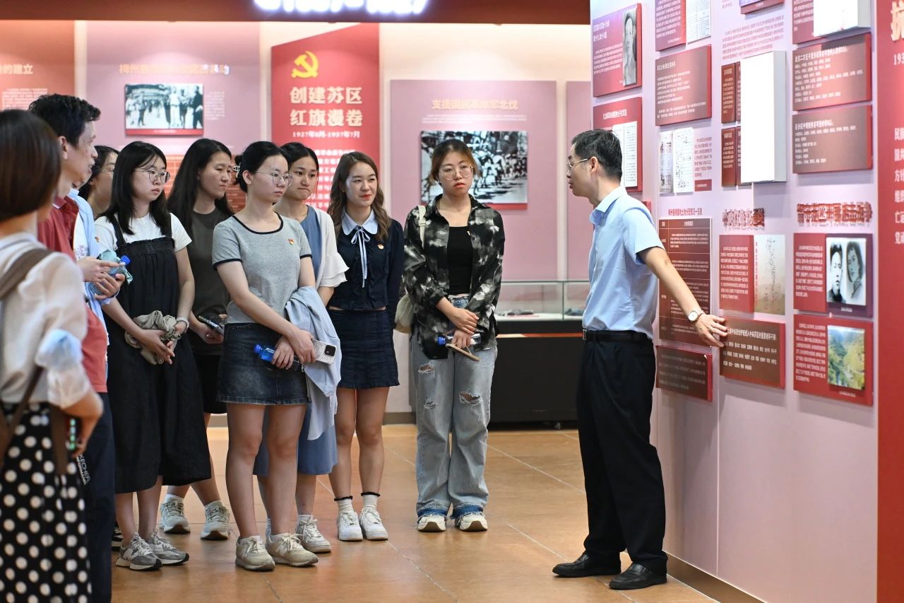 7月12日下午 18jav 、光华口腔医学院师生党员在嘉应学院马克思主义学院李学明副院长、杨杰副教授引导和讲解下依次参观了“开天辟地 春雷激荡”“创建苏区 红旗漫卷”“解放烽火 照亮梅州”等10个单元展区。结合丰富的视频资源,配合着详实的文字资料,全过程全方位地了解学习到梅州人民在中国共产党领导下的奋斗历程和红色苏区发展成就。