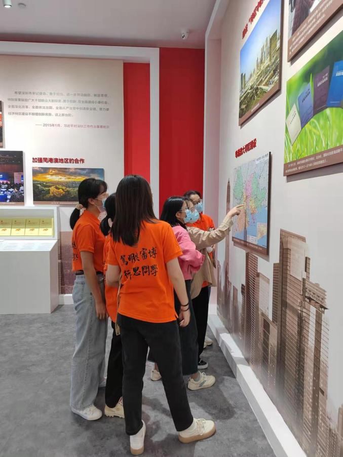 在深圳党史馆,师生党员统一佩戴党员徽章,循着历史发展脉络,先后参观了“红旗屹立深圳湾”“社会主义新宝安”“改革开放排头兵”“新时代的先行区”四部分展区,了解从解放宝安到建设边防,从“杀出一条血路”到“走出一条科学发展的新路”,再到加快建设中国特色社会主义先行示范区的历史进程。翔实的档案资料、生动的图片视频,展现了深圳改革开放和历史大潮中的伟大变革,吸引着党员们不时驻足观看,仔细阅读,认真思考。在参观学习中,党员们进一步了解到深圳特区在中国共产党领导下进行革命、建设和改革的不懈奋斗史、所取得的辉煌成就,为深圳经济特区敢闯敢试、敢为天下先的“拓荒牛”精神所鼓舞和震撼!