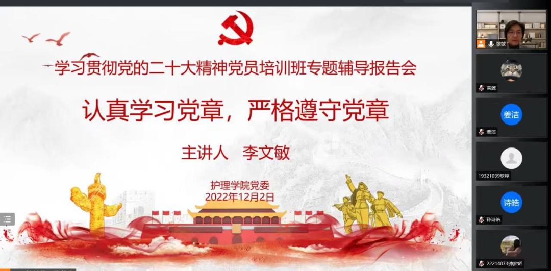 根据学院学习贯彻党的二十大精神党员培训班方案安排,12月2日晚上7点, 18jav 通过腾讯会议线上举行第二次专题辅导报告会。本次报告会由学院党委副书记李文敏同志主讲,主题为“认真学习党章,严格遵守党章”。学院全体党员、发展对象、入党积极分子以及部分学生马克思主义学习小组成员约230人参加了报告会。报告会由学院党委书记陈昌龄同志主持。